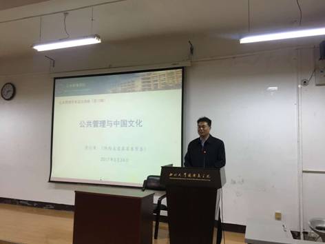 3月24日下午,第72期公共管理学术前沿讲座在我院成功举行。中共眉县县委常委、组织部部长景行军结合自己对传统文化的研究体会,以“公共管理与中国文化”为主题做了一场别开生面的学术讲座。西北大学MPA中心副主任靳连冬副教授出席并主持讲座,2016级MPA班全体学员认真聆听了报告。