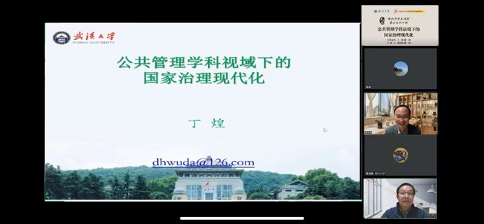 2022年11月18日19点到21点,由西北大学社科处、公共管理学院(应急管理学院)联合主办的“侯外庐学术讲座”第260讲借助腾讯会议在线成功举办。武汉大学国家治理与公共政策研究中心主任丁煌教授受邀作了题为“公共管理学科语境下的国家治理现代化”的学术报告。公共管理学院(应急管理学院)副院长翟绍果教授主持讲座,翟绍果教授代表学校对丁煌教授表示热烈欢迎和衷心感谢,并预祝本次讲座成功举办。我院200余名教师、研究生及本科生参与了此次讲座。
