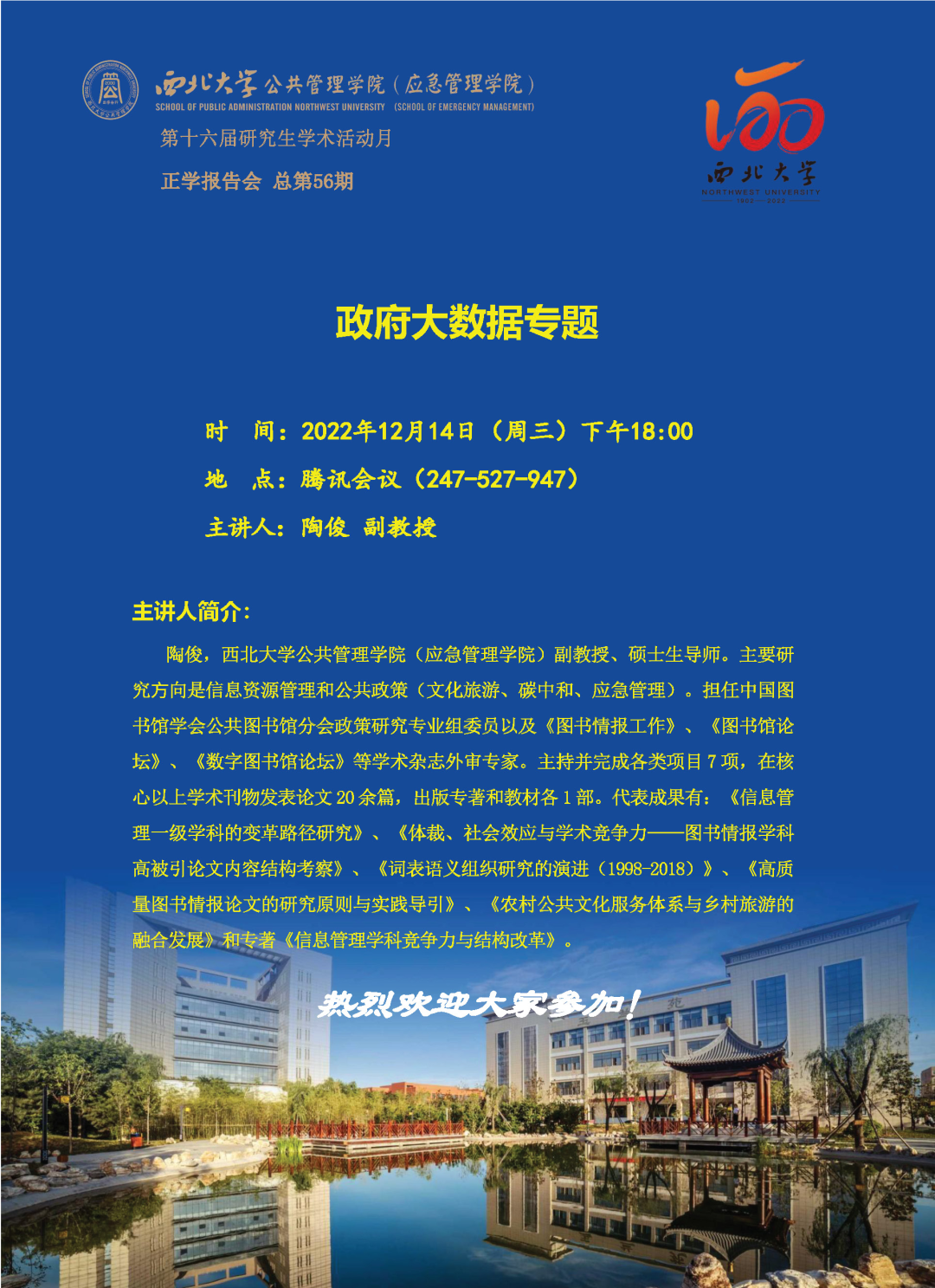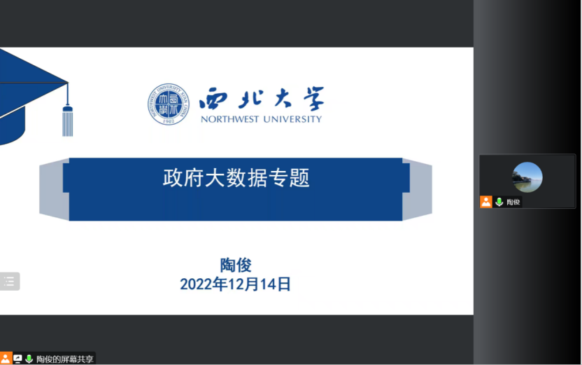 2022年12月14日晚18:00,西北大学公共管理学院陶俊副教授在线上为我院2022级全体硕士研究生作了题为“政府大数据专题”的讲座。