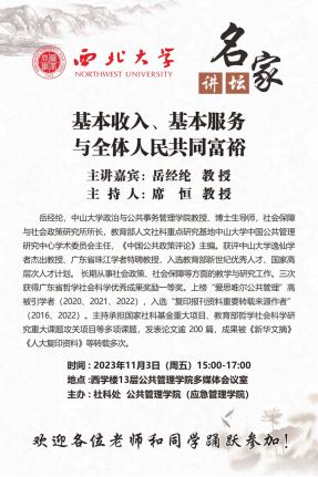 2023年11月3日下午,西北大学社科处、公共管理学院(应急管理学院)联合主办的“名家讲坛”于西学楼13层多媒体会议室成功举办。中山大学政治与公共事务管理学院岳经纶教授受邀作了题为《基本收入、基本服务与全体人民共同富裕》的学术报告。本次讲座由公共管理学院(应急管理学院)席恒教授主持,我校百余名老师、博士、硕士研究生参与。