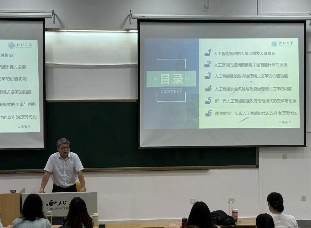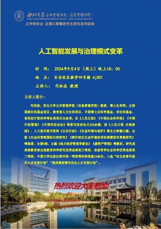 2024年9月4日晚18:00,西北大学公共管理学院司林波教授在多媒体教室为我院2024级全体硕士研究生作了题为“人工智能发展与治理模式变革”的专题讲座。