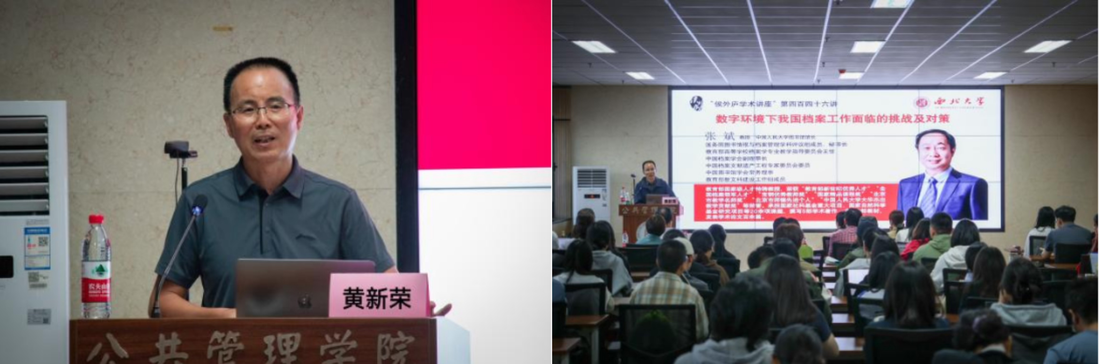 2025年9月19日晚,西北大学“侯外庐学术讲座”第四百四十六期在长安校区西学楼13层公共管理学院多媒体会议室顺利开讲。本次讲座特邀中国人民大学图书馆馆长、信息资源管理学院教授张斌开展“数字环境下我国档案工作面临的挑战及对策”专题讲座。张斌教授是教育部国家级人才特聘教授,担任国务院信息资源管理学科评议组成员、秘书长,教育部档案学专业教学指导委员会主任,中国档案学会副理事长,中国档案文献遗产工程专家委员会委员,中国图书馆学会常务理事,高等学校图书馆分会副主任委员,北京高校图书馆工作委员会副主任委员兼秘书长,北京高校图书馆文献资源保障体系(BALIS)管理委员会常务副主任等多项职务,获得“教育部新世纪优秀人才”“宝钢优秀教师奖”“北京市教学名师奖”“北京市师德先进个人”等荣誉。此次讲座由西北大学公共管理学院黄新荣教授主持,陕西省档案馆干部一行6人受邀参与和交流,公共信息资源管理系全体师生参加。
