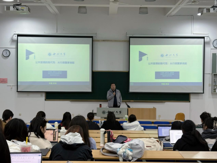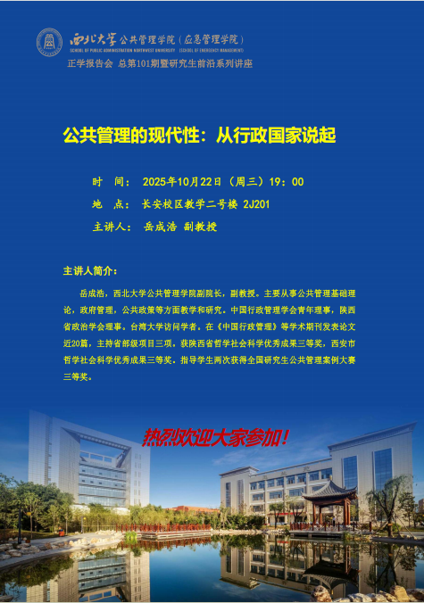 2025年10月22日晚19:00,西北大学公共管理学院岳成浩副教授在2J201为我院2025级全体硕士研究生作了题为“公共管理的现代性:从行政国家说起”的专题讲座。