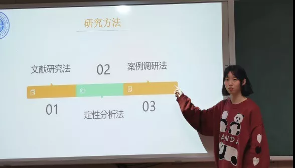 该组同学从研究背景、研究目的、研究方法、研究基础和研究内容五个方面展开介绍。赵颖同学从政策环境以及社会现实出发讲解了加强基层政务公开的重要意义。