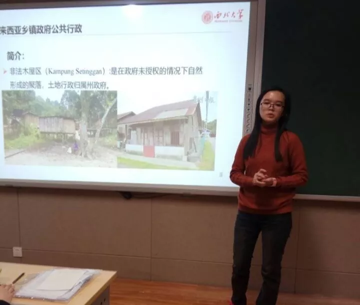 在主题分享的第二部分,翁巧倩同学向我们介绍了马来西亚的乡镇政府公共行政,并且对马来西亚的政治体制、行政区划以及马来新村、华人新村等不同的乡村形态与同学们进行了交流分享,给同学们打开了新的视野,赢得了现场同学的阵阵掌声。