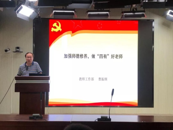 曹振纲部长从习近平总书记2013年9月致全国教师的慰问信中提出的“三个牢固树立”讲起,回顾了习近平总书记对广大教师的殷切期望,并进一步从“实现中华民族伟大复兴的中国梦、人才培养和“双一流”建设的必然要求、个人职业发展的必然要”等三个方面强调了加强师德修养的重要意义,从“学榜样,做四有好老师;学规范,提高师德修养;守底线,切勿触碰红线”三个方面提出了加强师德修养的意见和建议。