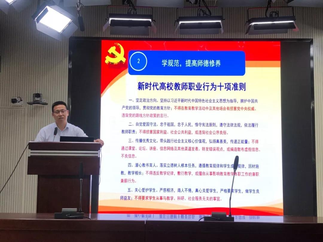 报告最后,曹振纲部长与全院教师一起学习了高校教师“红七条”、《严禁教师违规收受学生及家长礼品礼金等行为的规定》、《新时代高校教师职业行为十项准则》、西北大学师德建设有关规定。