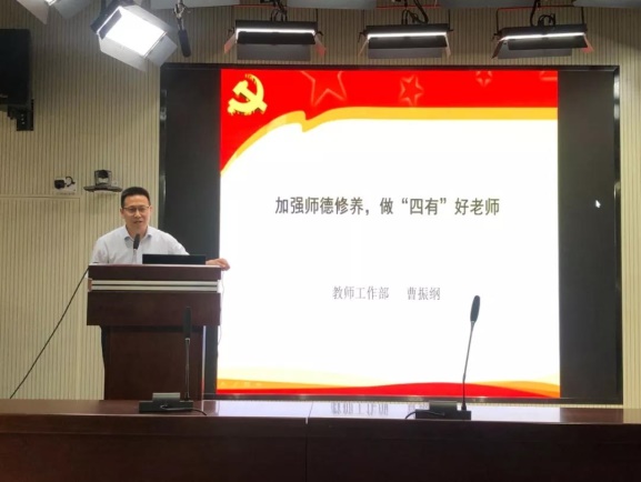 为进一步贯彻落实《新时代高校教师职业行为十项准则》,加强学院师德师风建设,6月5日下午,院党委邀请校教师工作部曹振纲部长,在我院全体教师会议上作了题为“加强师德修养,做‘四有’好老师”的专题报告。报告由院党委负责人主持,学院全体教师聆听了本次报告。