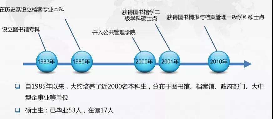 2000年,档案学专业并入公共管理学院成立图书馆学与档案学系,后改名为公共信息资源管理系。2001年获得图书馆学二级学科硕士点,开始招收图书馆学研究生。2010年,获得图书情报与档案管理一级学科硕士点,2012年开始招收档案学专业硕士。