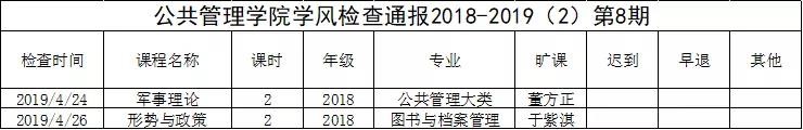 2019年4月18日至2019年5月5日期间,学院学生工作办公室组织对我院学生的上课情况进行检查。在检查中,我院有个别学生缺勤,望及时改正,以正我院学风学纪。