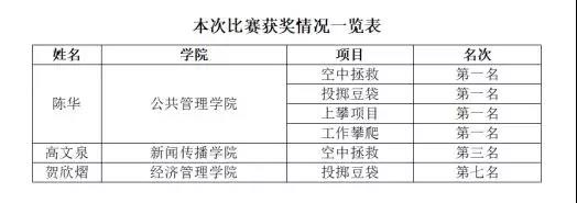 本次比赛依据国际攀树比赛规程共设置投掷豆袋、空中拯救、工作攀爬、速度攀爬、上攀项目等5个单项。其中我院的陈华同学包揽了大学生男子组5个单项比赛的4项第一名,与体育教研部教师陈超一同晋级大师挑战赛。