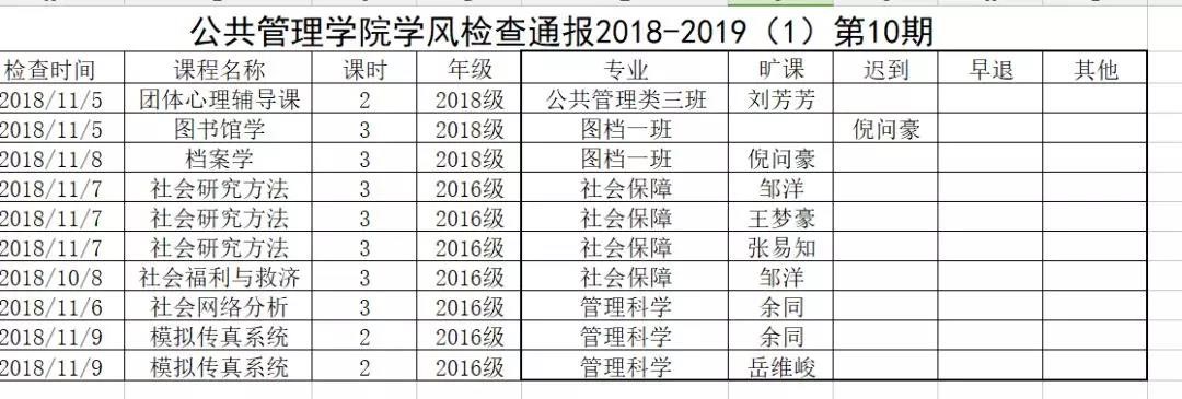 11月5日至11月9日期间,学院学生工作办公室组织对我院学生的上课情况进行检查。在检查中,我院有个别学生缺勤,望及时改正,以正我院学风学纪。