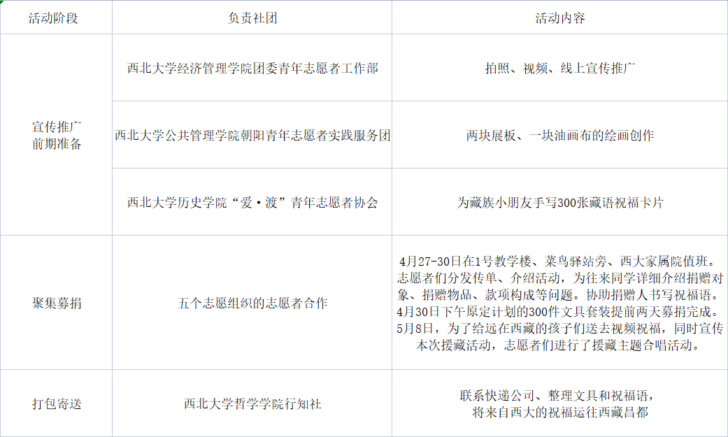 本次活动主要分为宣传准备、筹集募捐、打包寄送三个阶段,分工如下: