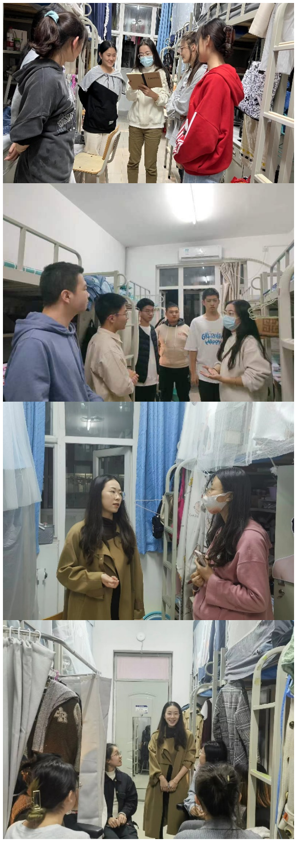 为进一步做好疫情防控工作,杜绝宿舍安全隐患,创造文明整洁的宿舍环境,公共管理学院积极响应学校号召,组织开展宿舍卫生安全检查活动。2022年10月15日晚,我院党委副书记韩杰老师、2019级辅导员陈露老师、2020级辅导员杨嘉仪老师、2021级辅导员杨琬钰老师、2022级辅导员王晶玉老师前往学生宿舍,对宿舍卫生安全进行了全面检查,并与同学们进行亲切的交流,深入了解同学的具体生活状况。