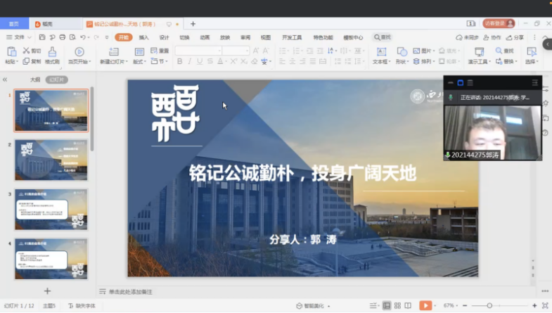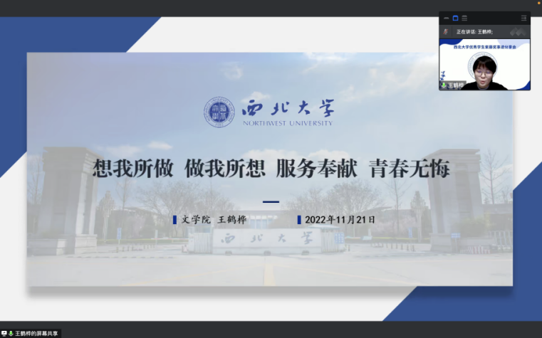 王鹤桦分享了自己的校级社团学习工作经历,呼吁学生工作者要有理想,敢担当,坚定信念并付出行动,永葆理想情怀,秉承服务宗旨,恪守学生本分。