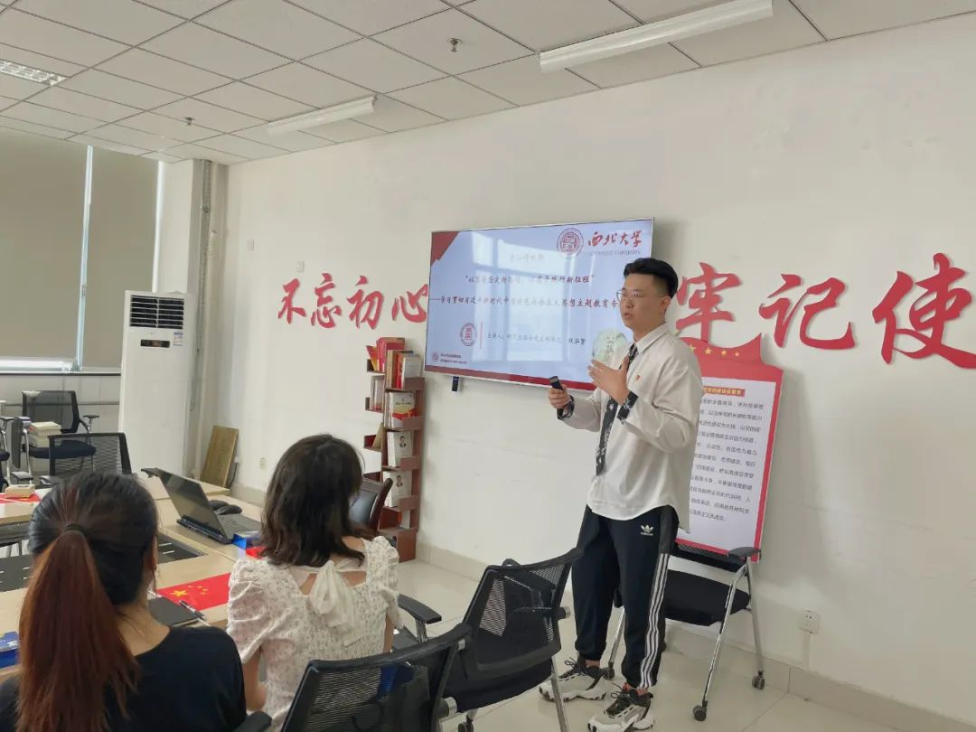 党支部书记刘泓贤同志作了题为《以笃学坚定新思想,以实干践行新征程——学习贯彻习近平新时代中国特色社会主义思想主题教育》的专题党课。作为新的伟大工程,党的建设是引领伟大斗争、伟大事业,最终实现伟大梦想的根本保证,充分证明全方位加强党的建设是一项凝聚共识的“伟大工程”。刘泓贤同志基于“明确全面从严治党的战略方针”的理论要求,从初心如炬(信仰)、嘉言如丹(言语)、双肩如铁(行动)三个维度,带领支部全体党员系统回顾了研究生联合党支部推进样板支部的建设思路、建设特色及建设成果。刘泓贤同志号召支部全体党员继续深入学习贯彻习近平新时代中国特色社会主义思想,从中汲取奋发进取的智慧和力量,坚持学思用贯通、知信行统一。