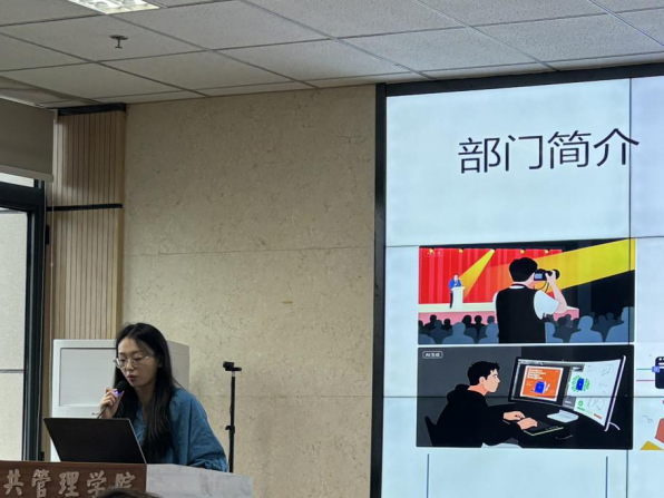 宣传部负责人张立在宣讲中强调,部门承担着服务同学、传递学院声音的职责,是提升学院影响力的核心力量。她展示了往期推文、海报和摄影作品,直观呈现了文案、设计、摄影三大核心工作,生动展现了宣传部的创意与活力。