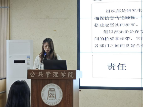 组织部负责人薛梦瑶分享了部门在活动统筹、财务管理、会议记录等方面的重要作用。她形象地比喻组织部是研究生会的“中枢神经”,赢得同学们的会心笑声与掌声,让新生对幕后支撑力量有了直观认识。
