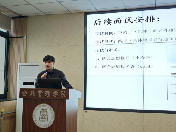 在各部门介绍结束后,研究生会主席胡鑫向同学们详细说明了报名方式与面试流程,耐心解答了大家的疑问。