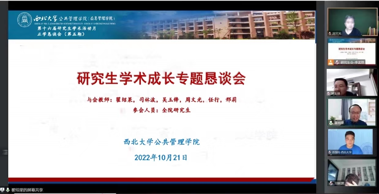 2022年10月21日晚19:00,公共管理学院(应急管理学院)第5期正学恳谈会在线上成功召开。本次恳谈会以“研究生学术成长”为主题,旨在搭建学生与学院的沟通桥梁,充分了解同学们在学术成长过程中遇到的问题,广泛收集同学们的意见和想法,帮助学院进一步完善研究生教育培养、教学及管理工作。公共管理学院科研副院长翟绍果教授,行政管理学位点负责人司林波教授、社会保障学系主任吴玉锋副教授、公共政策与管理系主任周文光老师,学院研究生秘书邢莉老师、博士生科研秘书任行老师,以及全院硕博研究生参与本次会议。