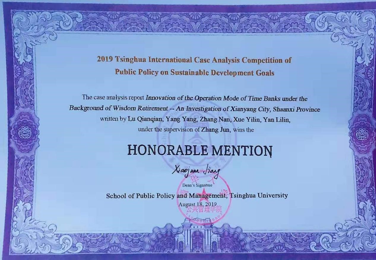 清华大学2019年全球SDGs公共政策案例分析大赛由清华大学公共管理学院主办,面向全球高校全日制本科生和硕士生,旨在为关注公共政策与社会问题的同学提供一个学习探索和思想交流的平台。大赛秉承清华大学“自强不息、厚德载物”的校训,发扬公共管理学院“明德为公”的精神,围绕中国践行联合国17项可持续发展目标情况选题,激发本科生、硕士生从具体案例入手,积极关注公共政策问题,深度了解中国现实国情,切实提升敏锐的问题意识、科学的分析能力和创新的思维方式。基地主任雷晓康教授指导的团队立足于咸阳市智慧健康养老时间银行,结合中国老龄化的发展趋势和时间银行在养老领域的发展情况,通过对咸阳市智慧健康养老时间银行的调查,主要讲述了“智能养老+时间银行”模式从概念到初步建立到发展状况的故事。研究了智慧养老背景下时间银行运营模式的创新,并分析了时间银行所体现的“新公共管理”方法。