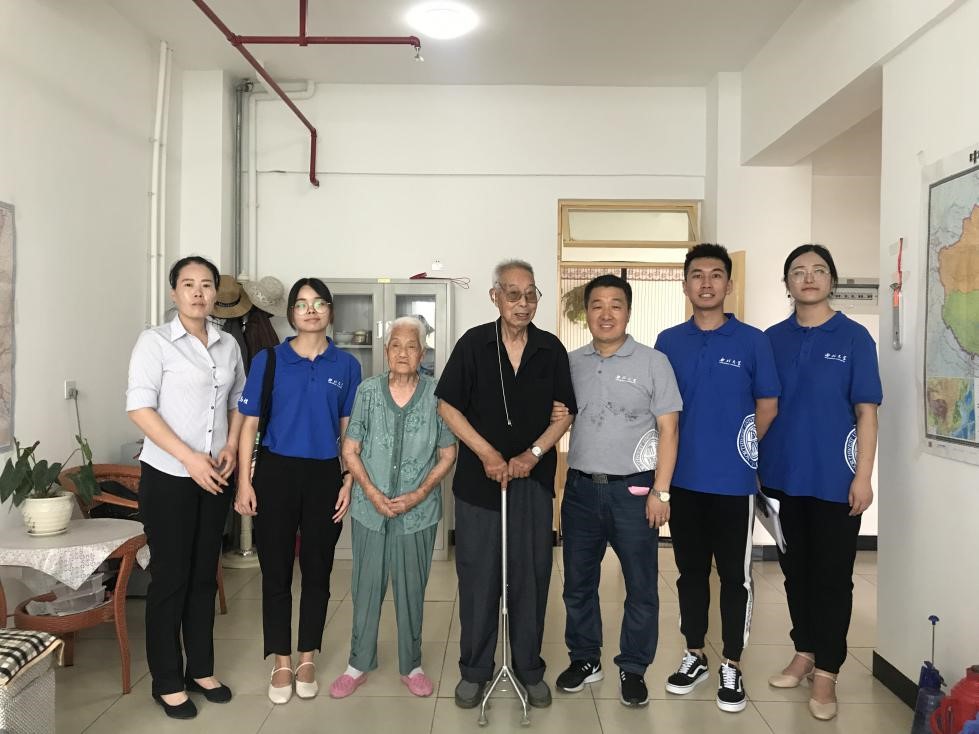 此次调研中,基地调研团队在与中心入住老人沟通中收获意外之喜,访谈过程中偶遇西北大学53级地质系老校友丁冰老人。老人得知我们调研团队一行人来自西北大学后,十分激动,为我们讲述了其当年作为西北大学第一届招收的地质系学生在校求学经历,表示了对于母校深厚的热爱与怀念之情,基地调研团队为老人介绍了母校今些年的发展变化,并与老人一起合影留念,记录了这次特殊的访谈经历。