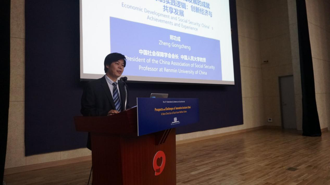 郑功成会长在题为“中国经济增长与社会保障发展的成就及其相互关系的实践逻辑:创新经济与共享发展”的主旨演讲中指出,中国是一个人口众多的后发国家,在前三十年创立的初级工业体系和极为丰富的劳动力资源基础上,经过近四十年的改革开放,取得了令人瞩目的经济发展成就,社会保障也在改革发展中从少数人的专利成为全民共享的福祉。他从经济增长成就、社会保障发展成就、民生改善程度三个方面用八张图表介绍了中国经济增长、社会保障发展与民生改善的主要成就。他强调,这两个发展成就不是简单的叠加,而是有着自己的实践逻辑,即创新经济与共享发展的逻辑。中国的案例证明了经济与社会保障之间可以相得益彰地共同发展,其关键在于不要将经济增长与社会保障发展视为对立面,而是要积极妥善地促使两者有机协同,并采取适合本国国情的策略加以推进。