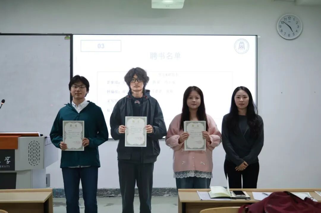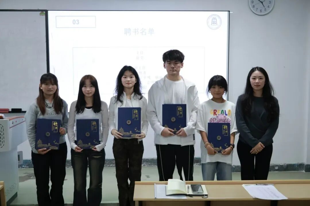 会议最后,杨琬钰老师为主席团成员、组长团成员颁发聘书,并一同合影留念。至此,公共管理学院全媒体中心2025-2026学年首次全体大会圆满落幕。