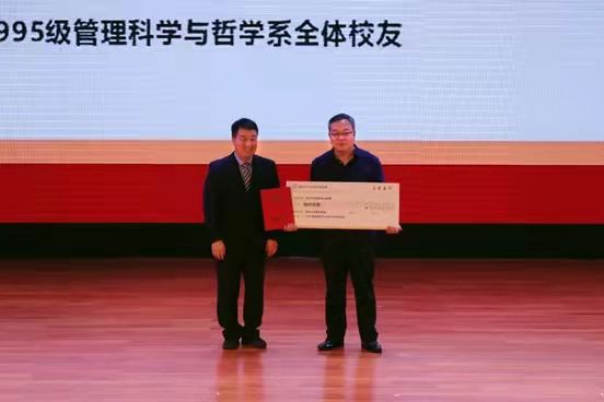(图为:西北大学公共管理学院成立二十周年庆典中“校友向母校捐赠仪式”——1995级管理科学与哲学系全体校友向母校捐款)