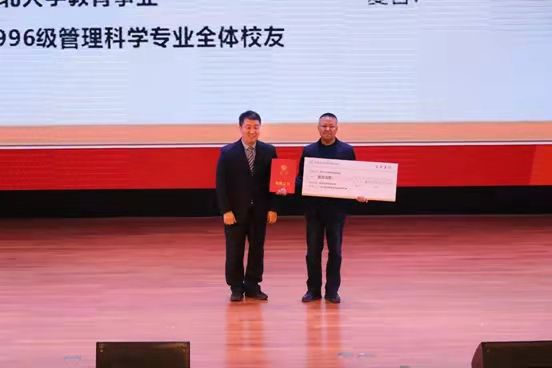 (图为:西北大学公共管理学院成立二十周年庆典中“校友向母校捐赠仪式”——1996级管理科学专业全体校友向母校捐款)