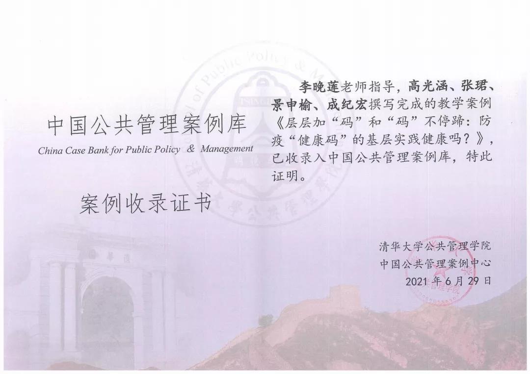 日前,我院雷晓康教授的硕士研究生成纪宏参与撰写的《层层加“码”和“码”不蹄:防疫“健康码”的基层实践健康吗?》案例获得“清华大学2020年中国公共政策案例分析大赛”优秀案例,经过修改完善后,成功收录于中国公共管理案例库。