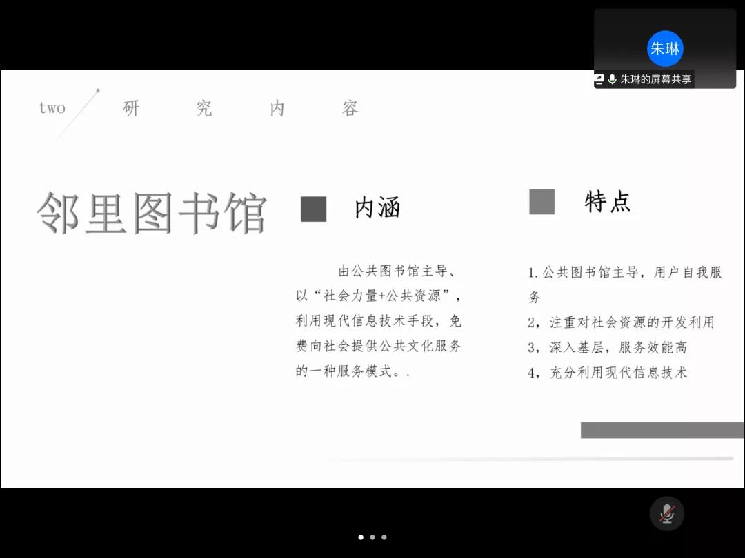 首先,朱琳同学作了关于邻里图书馆相关研究的汇报,认为邻里图书馆是公共图书馆创新服务模式的成功探索,其实践过程中充满社会互动性;结合图书馆学五定律、长尾理论、新公共服务理论从理论的角度对邻里图书馆进行分析,加深对邻里图书馆现实意义的全面理解,同时提出推动邻里图书馆可持续发展的建议。