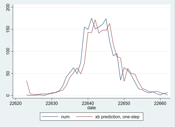 从图2中可以看出,红线与蓝线的走势基本一致,差距基本可以接受。实际上,对于一列像确诊病例数据这样变化复杂的时间序列数据,能找到一个走势基本一致的模型,实非易事。接下来,我们使用这个模型预测未来一周的确诊病例数量走势,如图3所示。
