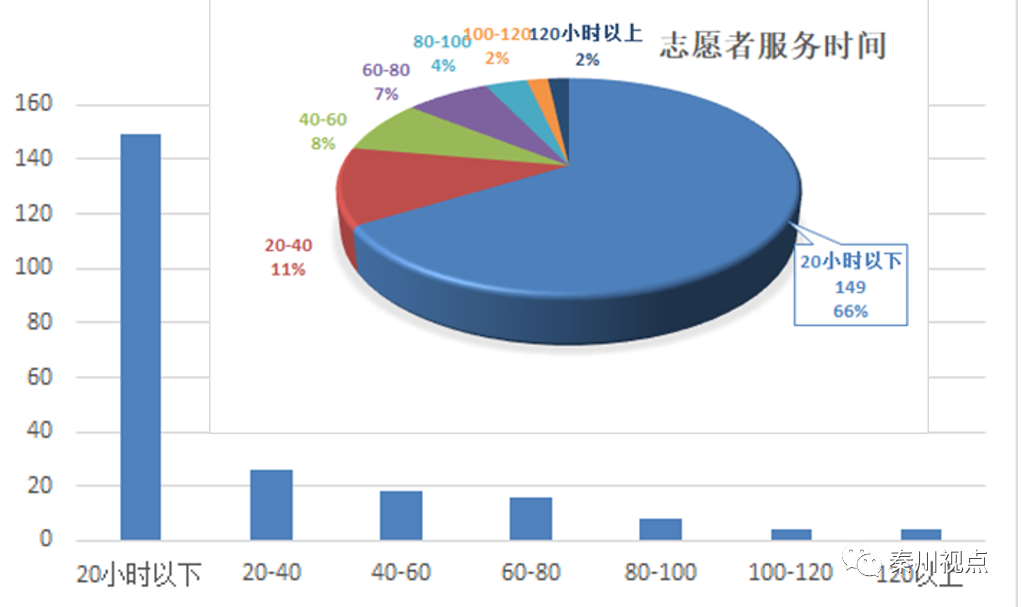 六是从志愿者从事志愿活动时身体和精神所能承受的服务时间观察,工作在20小时以内的志愿者占调查份数66%;从身心健康能够承受20-40小时工作强度和能力的志愿者占11%;身体健康能够承受40-60小时服务时效的志愿者占8%;超过60-80小时的志愿者占7%;坚持服务80-100小时的志愿者占4%;持续工作100-120小时的志愿者占2%;超过120小时或长期坚持下来的志愿者占2%。