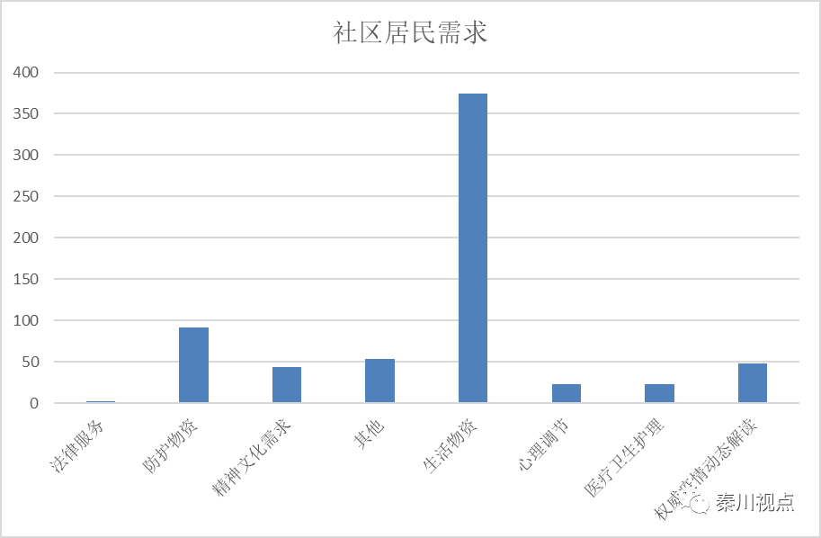 五是从阻击疫情和社区防控工作需求侧与供给侧观察,社区群众对基本的生活物资需求占比突出,反映了在重大事件或突发灾难面前,群众的求生欲望和生存意愿非常强烈。这是疫情防控需要关注和解决的重点和难点,也是打赢防疫“歼灭战”核心和重要保障。民心稳则社会安,对阻击疫情、预防反弹和应对疫情蔓延的防疫措施及救护物资有着迫切而合理心理诉求和期待。