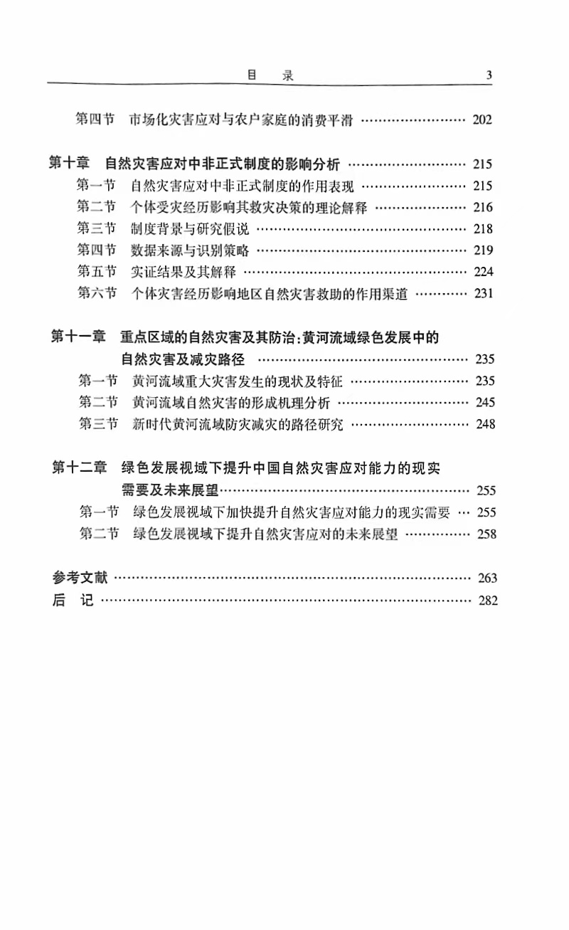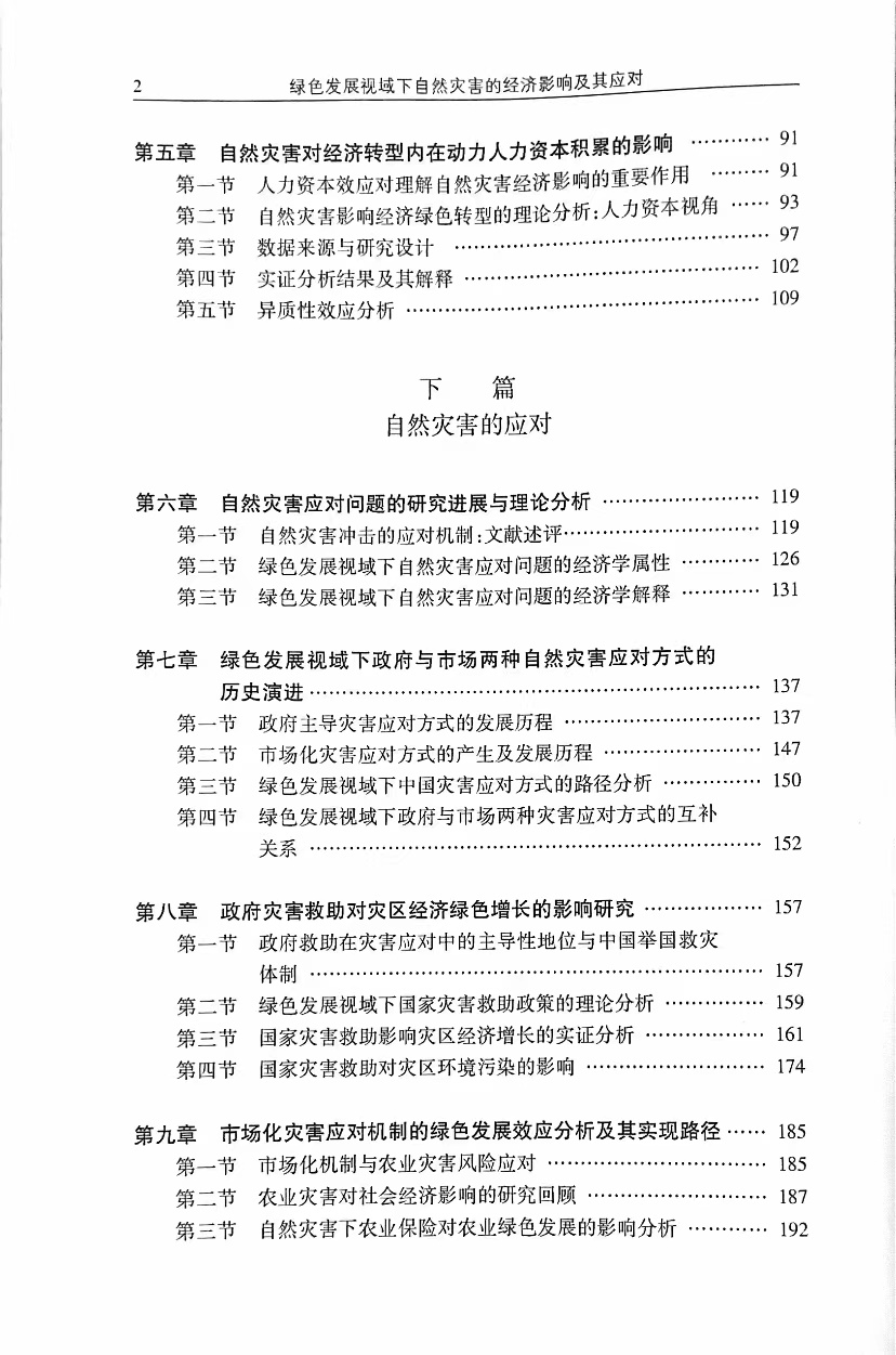 中国是世界上自然灾害最为严重的国家之一,灾害类型多,分布地域广,且发生频次高、强度大、损失严重。自然灾害频发是影响我国绿色发展的重要因素。因此,从绿色发展目标要求出发,研究绿色发展视域下自然灾害的经济影响及其应对问题,具有重要的理论价值与现实意义。本书聚焦于中国自然灾害的社会经济影响及其应对问题,内容分为上下两篇。上篇主要从绿色发展视域出发研究了自然灾害的社会经济影响,通过构建绿色发展目标下自然灾害影响经济增长的理论模型,区分了自然灾害损失对经济增长产生的短期及长期影响,阐释了其作用机制;并结合中国典型自然灾害案例,分析自然灾害对物质资本和人力资本积累的影响及其作用路径。下篇聚焦于自然灾害的应对问题,阐释了绿色发展视域下自然灾害应对的经济学属性;对市场化灾害应对、国家灾害救助和非正式制度建设在中国灾害应对中的实践效果进行了实证研究;并通过对重点区域自然灾害及其应对策略的分析,提出绿色发展视域下完善我国自然灾害应对体系的对策建议。