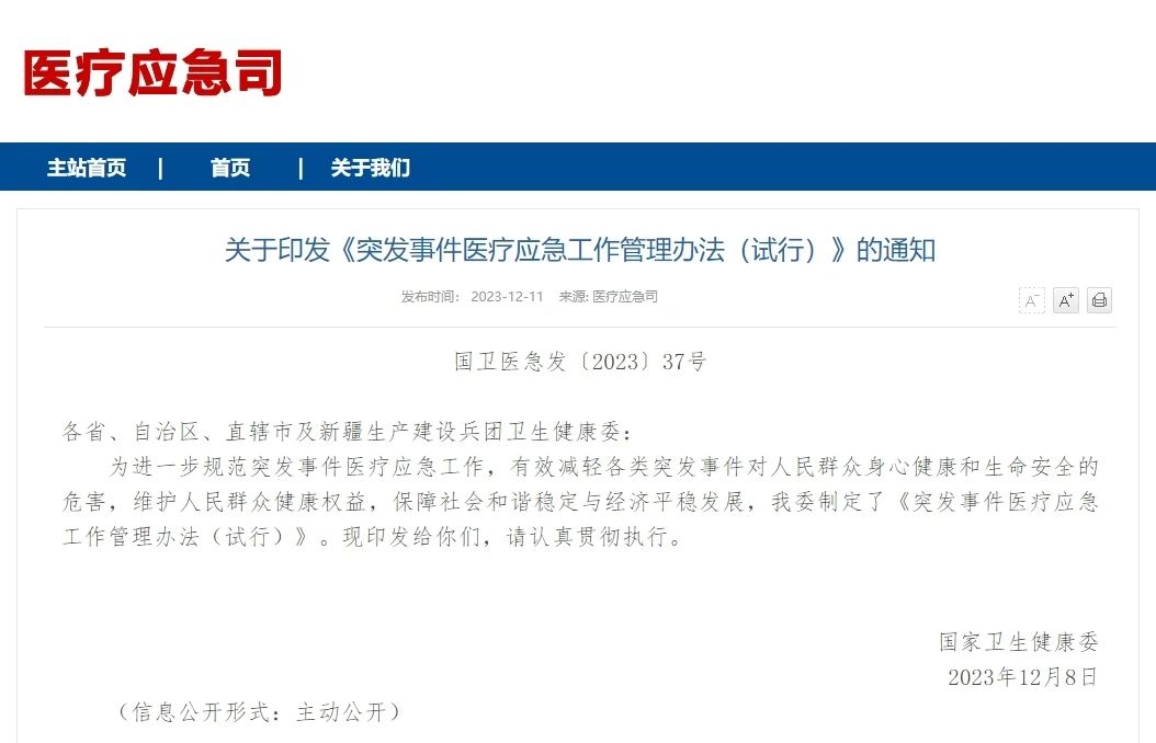 近日,国家卫生健康委印发《突发事件医疗应急工作管理办法(试行)》。《办法》指出,地方各级卫生健康行政部门应当建立突发事件的应急响应机制,根据突发事件类型,启动应急响应,在属地党委和政府领导下,加强部门协同,完善应急力量,快速反应,高效应对各类突发事件,开展医疗救援;伤病员救治按照集中资源、集中专家、集中伤病员、集中救治的“四集中”原则,首选收治在医疗救治能力和综合水平强的二级以上综合医院、中医医院和中西医结合医院。
