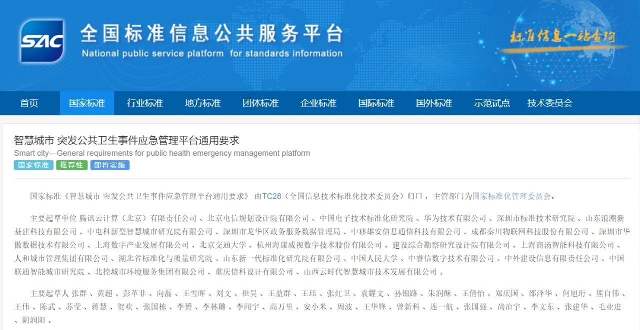 (市场监管总局批准发布《智慧城市 突发公共卫生事件应急管理平台通用要求》)