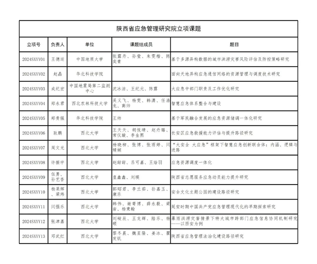 根据《陕西省应急管理研究院关于申报2024年现实问题科学研究项目的通知》,经过专家筛选、负责人汇报、专家评议等环节严格把关,《基于多源异构数据的城市洪涝灾害风险评估及防控策略研究》等13项课题获得立项。