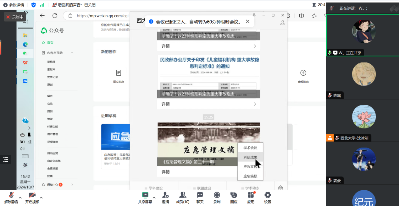 为进一步加强“西大应急”新媒体团队建设,提高新一届团队成员专业素养和履职能力,10月7日下午,“西大应急”新媒体团队举办线上岗前培训会。会议由采编组组员沈冰洁主持,运营主任王纪元、副主任王英琴就制度文件和编辑实操进行培训。此次会议,共有8名2024级应急管理专业硕士研究生参加培训。