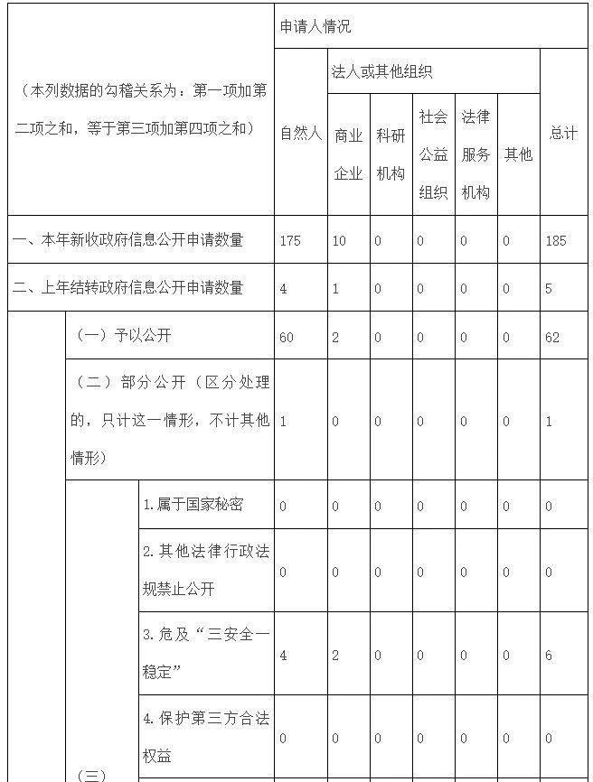 (二)依申请公开方面。全年共办结政府信息公开申请185件,同比增长26%。从申请主体看,公民申请占94%,法人或其他组织申请占6%;从申请形式看,网络申请占57%,邮寄申请占43%;从申请内容看,主要围绕事故灾害调查处理、事故灾害统计分析、应急管理行政执法、安全生产失信主体、安全评价等方面;从办理结果看,予以公开62件,部分公开1件,不予公开12件,无法提供29件,不予处理10件,其他处理71件(其中32件为办理过程中主办司局经电话沟通解决申请人相关诉求后,申请人提交撤销申请,提前终止办理程序) 。