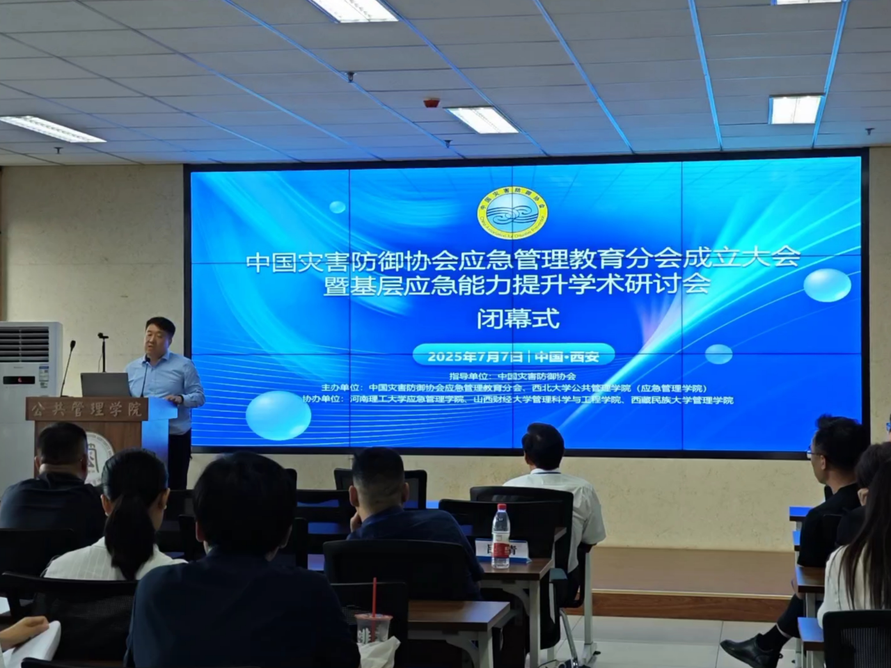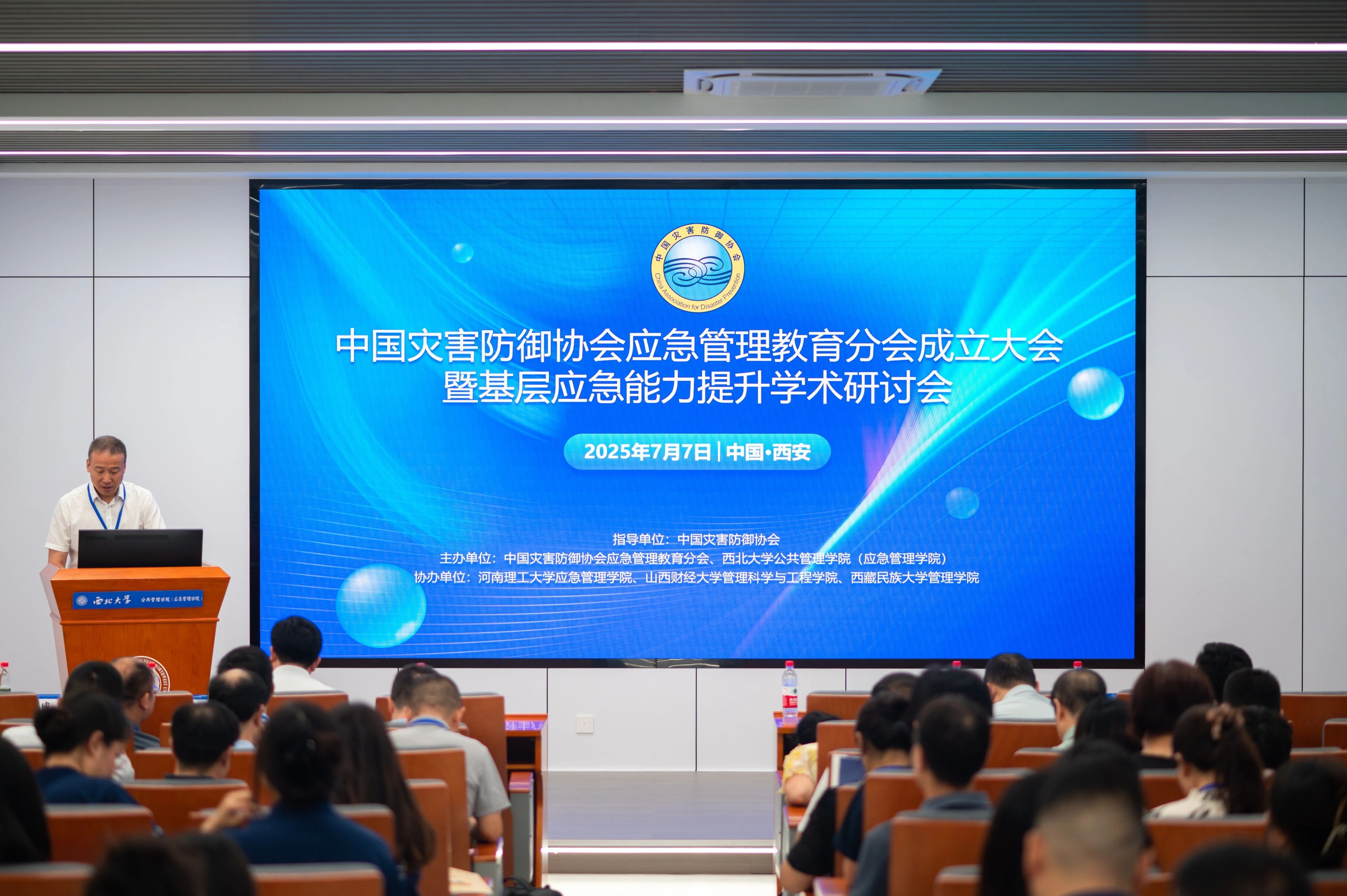 2025年7月7日,受中国灾害防御协会指导,由中国灾害防御协会应急管理教育分会、西北大学公共管理学院(应急管理学院)主办,河南理工大学应急管理学院、山西财经大学管理科学与工程学院、西藏民族大学管理学院协办的中国灾害防御协会应急管理教育分会成立大会暨基层应急能力提升学术研讨会在西北大学长安校区宏观经济大楼一层山峰报告厅隆重召开。中国灾害防御协会会长郑国光、陕西省应急管理厅党委委员、副厅长李虎平,西北大学副校长曹蓉出席了分会成立大会。武汉大学丁煌教授、河南理工大学夏保成教授、暨南大学蔡立辉教授、中国科学院科技战略咨询研究院陈安研究员、中国人民大学王宏伟副教授分别做主旨演讲。来自全国20多所高校和科研机构的100多位专家学者参加了本次研讨会。
