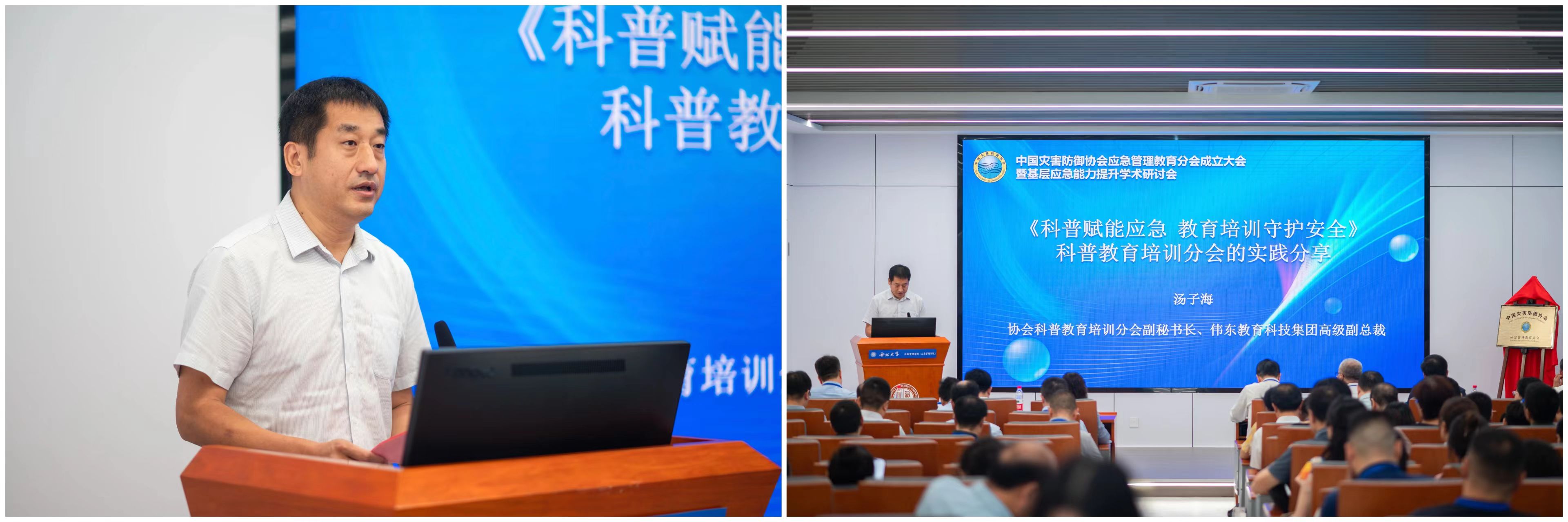 中国灾害防御协会会长郑国光、西北大学副校长曹蓉共同为中国灾害防御协会应急管理教育分会揭牌剪彩。协会科普教育培训分会副秘书长汤子海(伟东教育科技集团)应邀分享了首届应急管理视频大赛的发展情况。