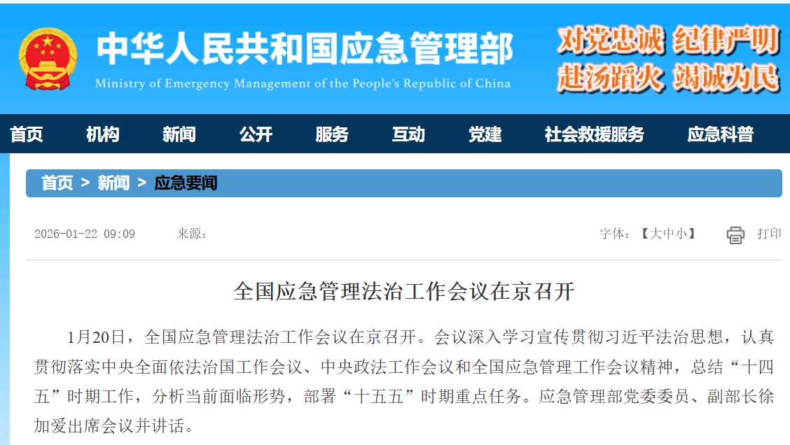 1月20日,全国应急管理法治工作会议在京召开。会议深入学习宣传贯彻习近平法治思想,认真贯彻落实中央全面依法治国工作会议、中央政法工作会议和全国应急管理工作会议精神,总结“十四五”时期工作,分析当前面临形势,部署“十五五”时期重点任务。应急管理部党委委员、副部长徐加爱出席会议并讲话。