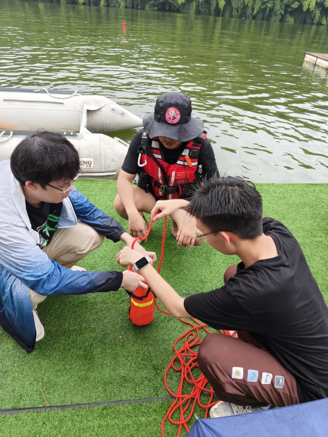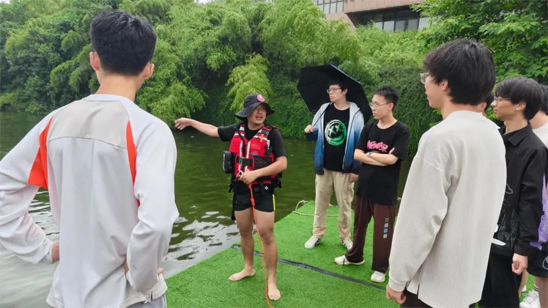 接下来,同学们参与了抛绳包救援、活饵救援、岸际救援、溺水施救等实践课程,聆听了教官的解说并观察示范动作。随后,同学们通过亲身实践,初步掌握了水上救援技术与设备的使用等基础知识。