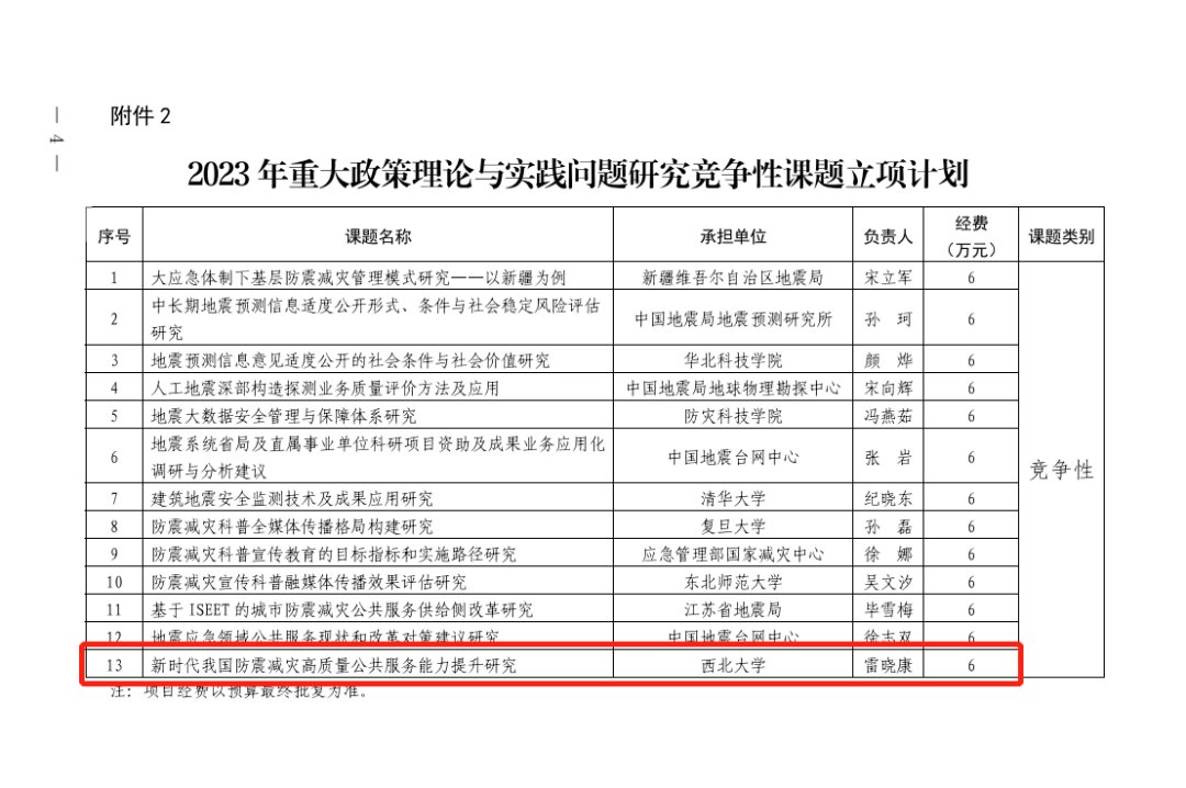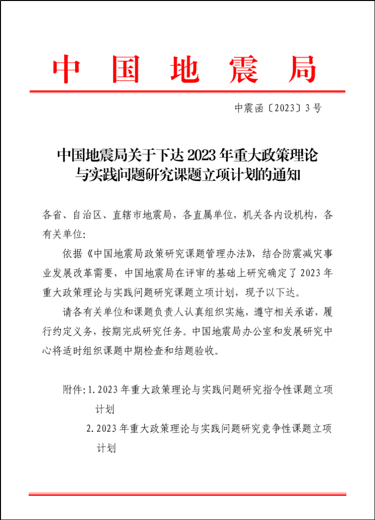 2023年1月11日,中国地震局公布了2023年重大政策理论与实践问题研究课题立项计划的通知。我院雷晓康教授主持的课题《新时代我国防震减灾高质量公共服务能力提升研究》获批立项。