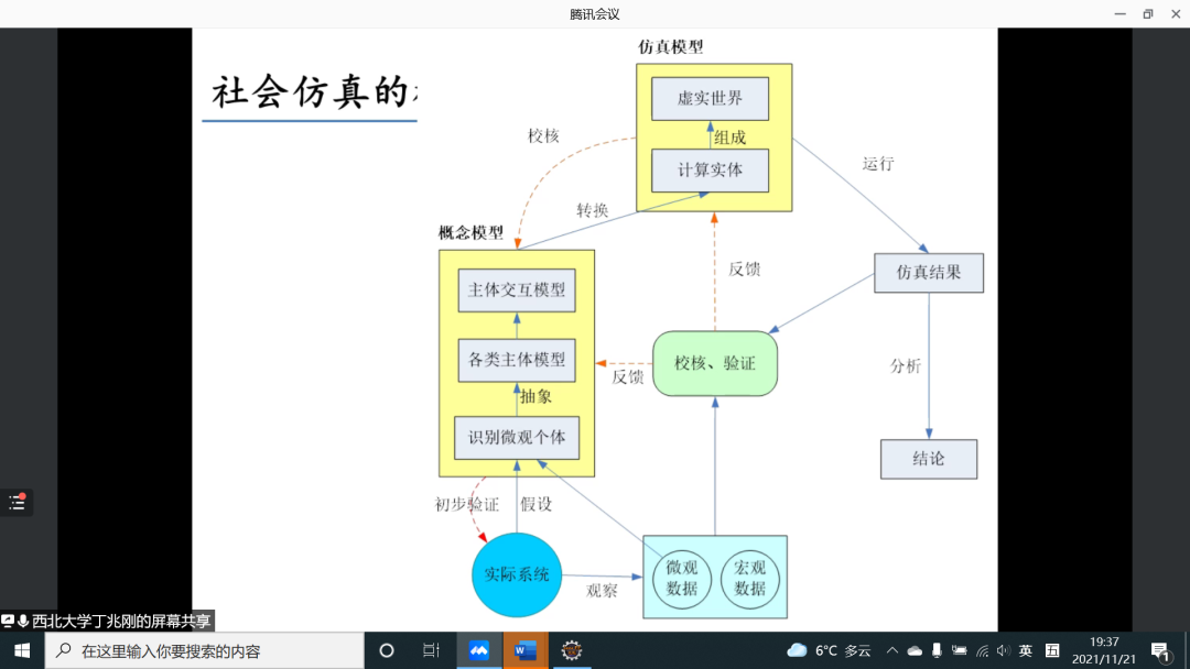 丁兆刚老师在许振宇老师有关复杂性科学的基础上,围绕复杂性科学的代表方法——社会仿真进行了主题报告。在引入科学研究范式变迁的分析后,丁老师从社会仿真的演进、社会仿真分析框架与步骤、社会仿真平台和多智能体模型等方面进行了逐层阐述,并结合应急管理领域的新近社会仿真研究成果进行了分类介绍,增进了与会者对社会仿真方法的应用理解。