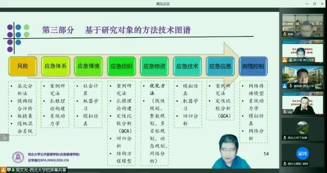 11月21日晚,我院举办了第二期应急管理团队系列学术研讨会,本次会议围绕应急管理研究方法与技术主题展开,我院中青年教师许振宇、丁兆刚、周文光三位报告人在腾讯会议平台作了精彩分享。河南理工大学应急管理学院张小兵院长、西北大学公共管理学院(应急管理学院)雷晓康院长、应急管理团队成员全程参加了会议,观看本次研讨会的校内外人员累计达100余人,会议由周文光老师主持。