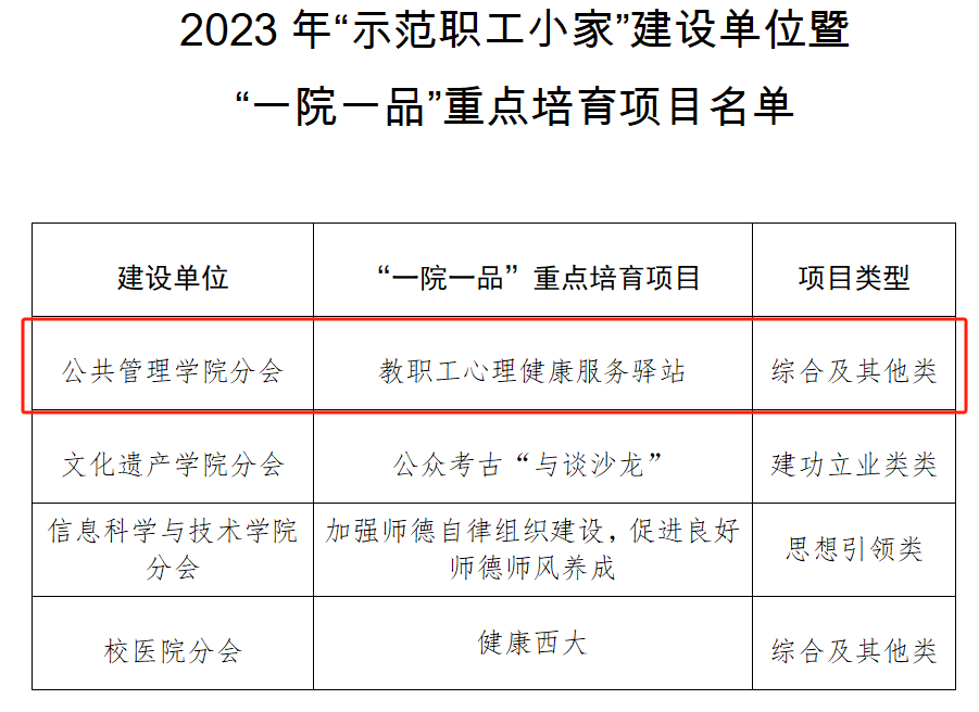 公共管理学院分会在校工会组织的2023年“示范职工小家”建设单位暨“一院一品”重点培育项目评审中,经过申报、论证和答辩等过程,成功获批2023年“示范职工小家”建设单位,“教职工心理健康服务驿站”获批“一院一品”重点培育项目。