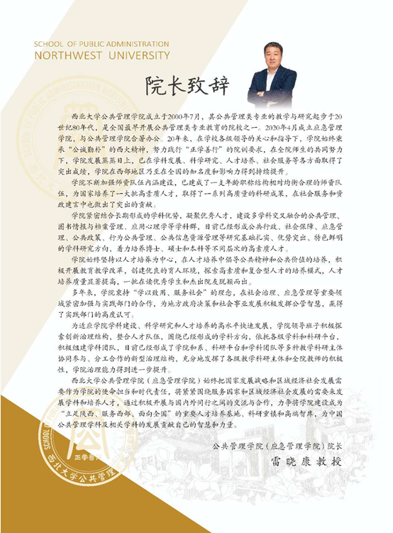 西北大学公共管理学院成立于2000年7月,其公共管理类专业的教学与研究起步于20世纪80年代,是全国最早开展公共管理类专业教育的院校之一。2020年4月成立应急管理学院,与公共管理学院合署办公。20年来,在学校各级领导的关心和指导下,学院始终秉承“公诚勤朴”的西大精神,努力践行“正学善行”的院训要求,在全院师生的共同努力下,学院发展蒸蒸日上,已在学科发展、科学研究、人才培养、社会服务等各方面取得了突出成绩,学院在西部地区乃至在全国的知名度和影响力得到持续提升。
